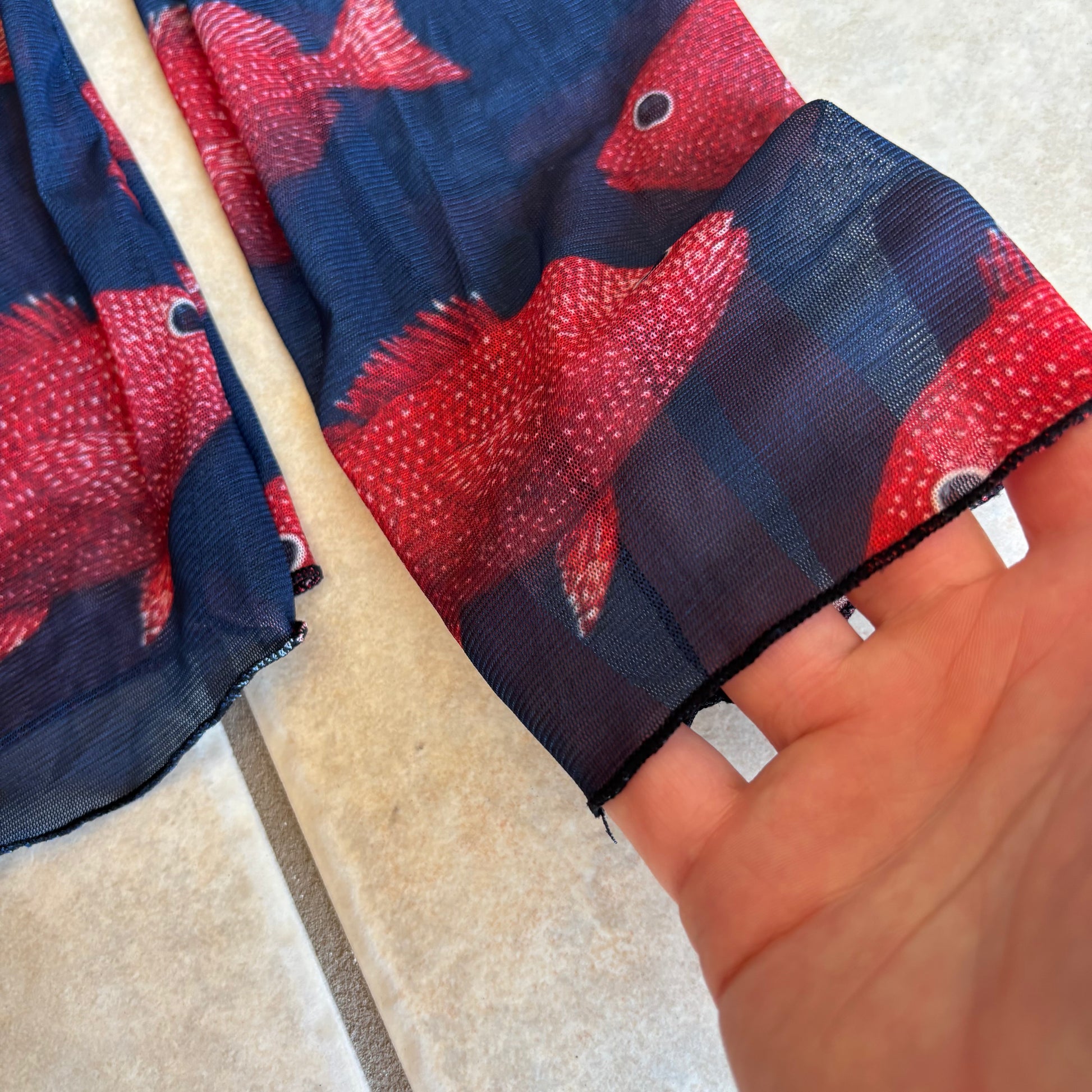 Turn heads in these bold mesh tops. Each design is crafted from a lightweight, semi-sheer mesh that hugs your shape with a thin, body con fit. The breathable fabric makes them perfect for layering or wearing solo when you want all eyes on you. With striking all over prints from vivid sea life to floral and shell motifs, these tops are not just clothes, they are statements. Slip one on and be ready to get noticed.