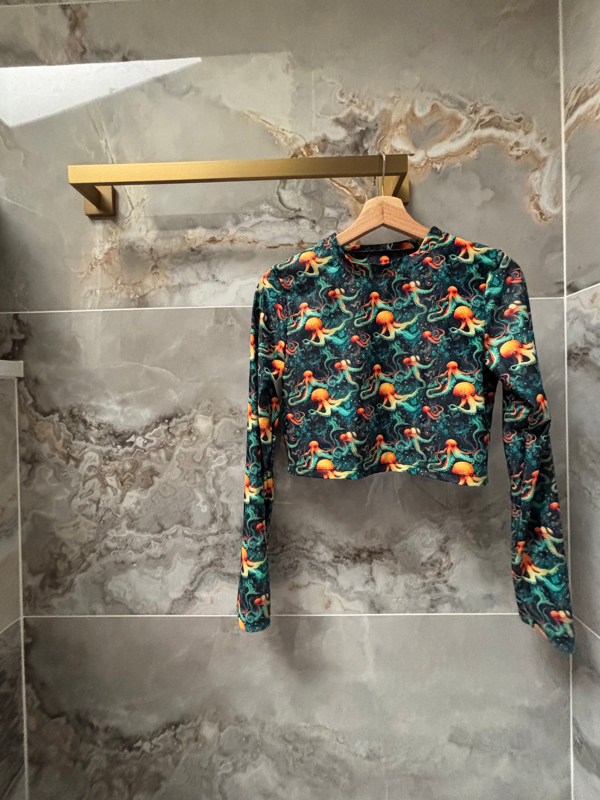 Dive into style and sun protection with this ocean-inspired swim set. The long-sleeve crop top and high-waisted bottoms feature a vivid octopus and jellyfish print on a deep-sea teal background. Made from 78% nylon and 22% elastane for a smooth, supportive fit with UPF protection that keeps your skin safe and your style bold.