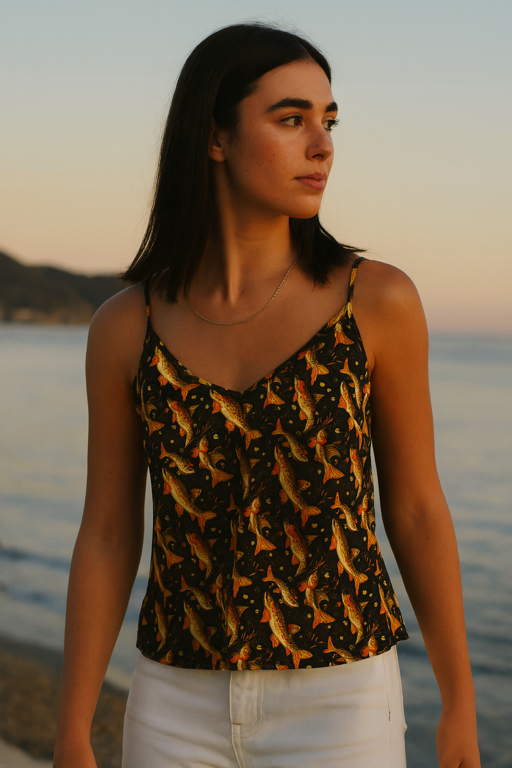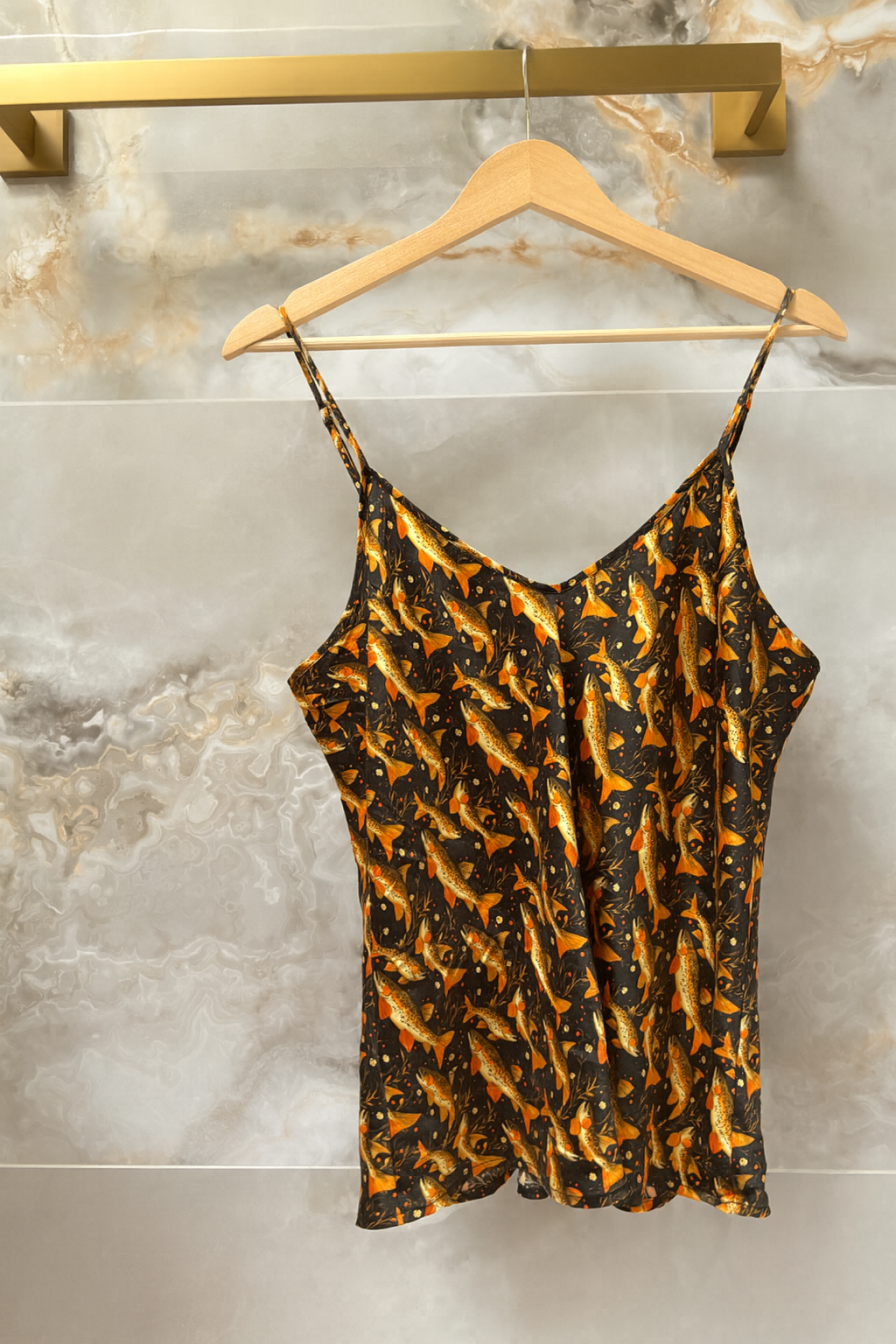 Cut from luxurious 19 mm mulberry silk, this adjustable-strap tank drapes effortlessly with a soft sheen and fluid feel. The golden fish add a touch of movement and depth, making it as striking for a night out as it is for lounging in comfort.